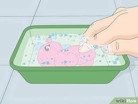 Soak or spray the toys: For small or soft toys, submerge them into the disinfectant solution for about 5-10 minutes. For larger toys or those that can’t be submerged, spray the solution generously, ensuring all surfaces are coated. Use a clean brush or sponge to scrub tough spots if needed.