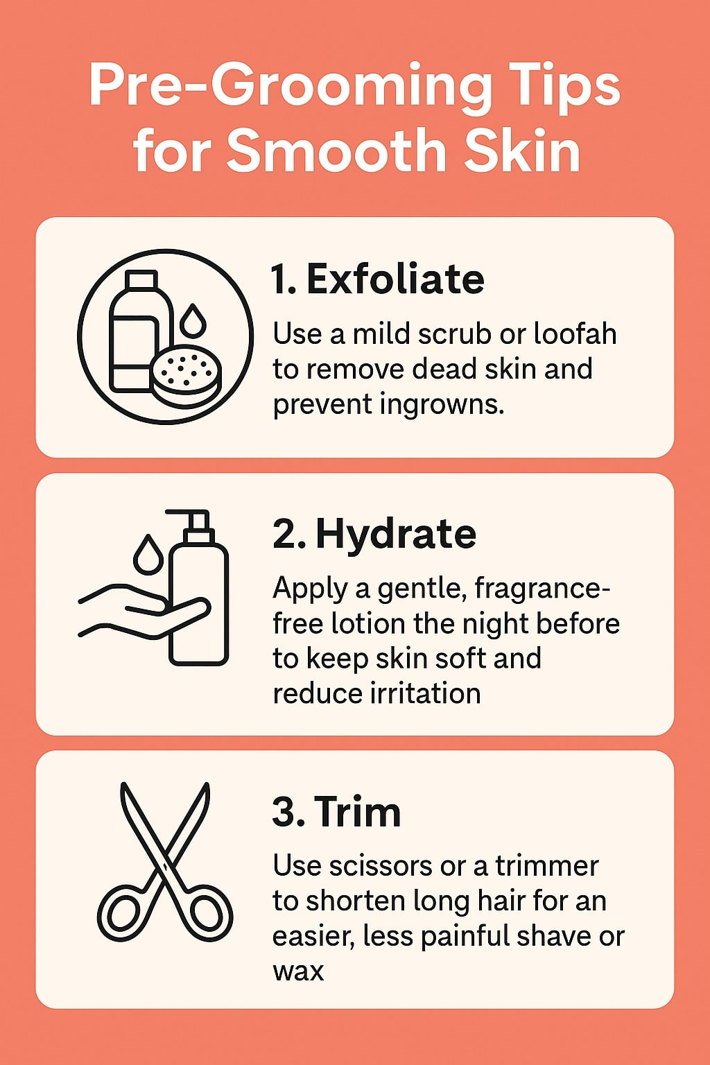 Prepare your skin before grooming by cleansing with a gentle, hydrating cleanser to remove dirt and excess oils. Applying a warm, damp towel to the area for a few minutes softens hair and opens pores, making grooming easier and less irritating. After grooming, rinse with cool water to close pores and then pat dry gently before applying moisturizer. Regularly exfoliating with mild scrubs or chemical exfoliants (like lactic acid) can help remove dead skin cells, but should be done sparingly to avoid over-drying.